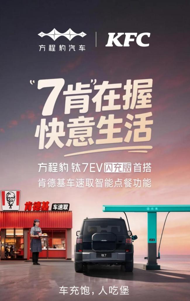 比亚迪新车首搭肯德基智能点餐 车内便捷点餐新体验 关键词: 2026-04-10 11:14:33  IT之家 比亚迪宣布方程豹钛 7 EV 闪充版将首次搭载肯德基“车速取”智能点餐功能,用户无需使用手机就能在车上完成点餐。该车型能够在点餐前自动匹配最近的肯德基,并在车机上完成点餐和支付流程。用户可以驾车到“车速取”取餐窗口,无需下车即可拿餐。此外,方程豹钛 7 EV 闪充版还配备了超大电动前备箱,改进了乘坐空间和装载能力,并引入了帝瓦雷音响系统。两驱版车型的纯电续航里程最高可达755公里。车辆尺寸为长4999(5050)mm、宽1995mm、高1865mm,轴距为2920mm,被称作“全球首款闪充纯电大方盒”。目前,比亚迪方程豹钛 7 EV 闪充版已全面开启预订,价格区间为22万至25万元,抢先下订的用户还将额外获得6个月的免费闪充权益。 (责任编辑:zhangxiaohua)